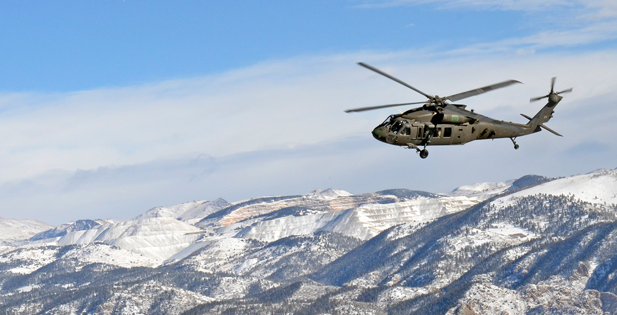 A UH-60 Black Hawk helicopter assigned to Task Force Saber makes a banking maneuver in the mountains of Fort Carson, Colorado. U.S. Army photo by SGT Keven Parry.